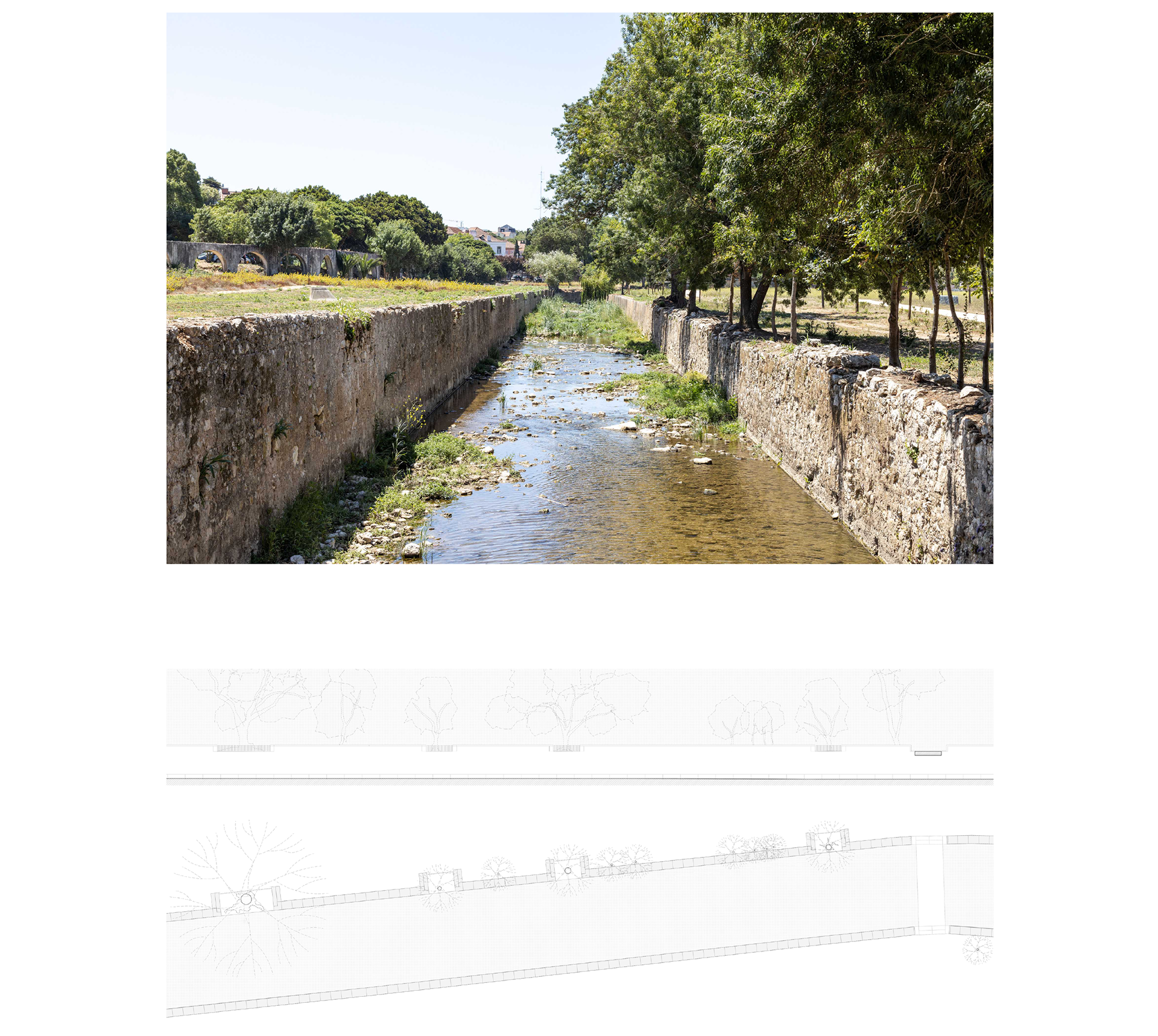 Tanto o anfiteatro, como o cais/jardim são desenhados segundo o limite do leito da ribeira, para não perturbar o seu curso natural. Para além de servirem de bolsas de retenção para prevenir problemas de cheias, permitem criar duas zonas de lazer em relação com a ribeira. No caso do anfiteatro, junto à ponte de pedra, foi desenhado em função das árvores existentes, para que fossem preservadas. Já o cais/jardim, ao contrário do anterior, podendo ser mais amplo e não tendo árvores para preservar, possibilita que os patamares desçam até o nível da água, permitindo que os utilizadores tenham uma relação mais franca com a ribeira.